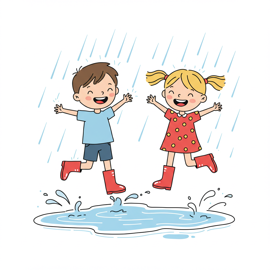 2 ai The Rainy Day Race Two kids race paper boats on a rainy afternoon.